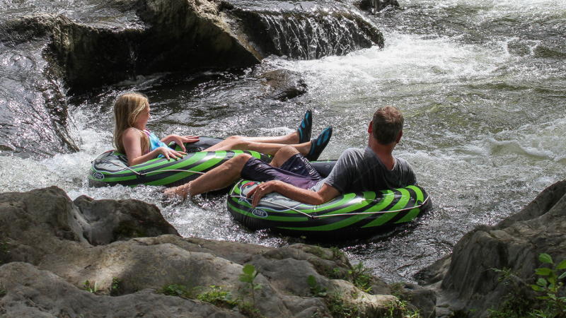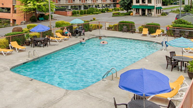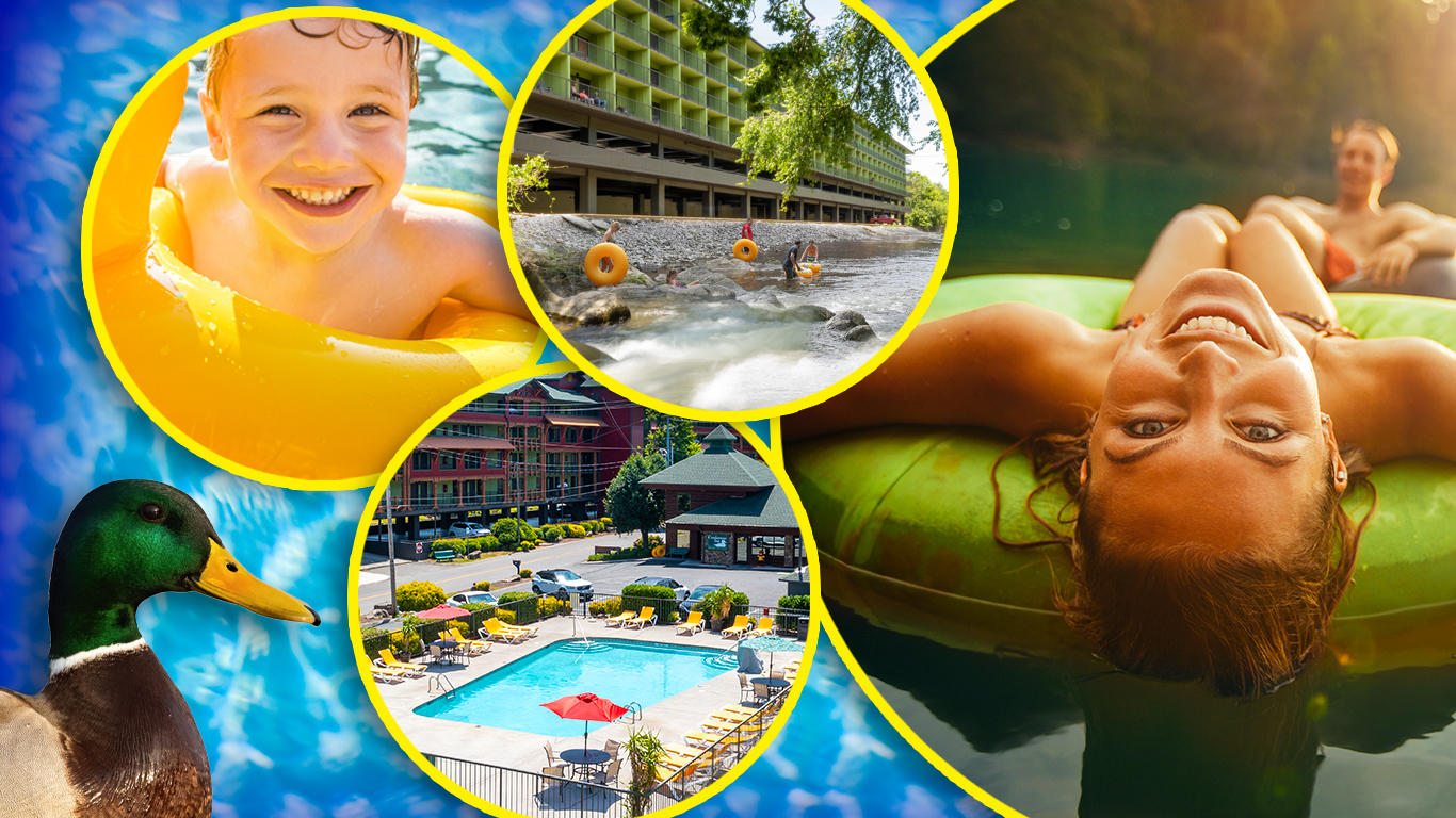 Creekstone Inn sits on both banks of the Little Pigeon River as it winds through Pigeon Forge. Both hotel buildings, Creekstone and Rivers Landing, feature balconies over the river.